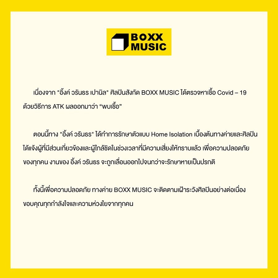 เนื่องจาก “อิ้งค์ วรันธร เปานิล” ศิลปินสังกัด BOXX MUSIC ได้ตรวจหาเชื้อ Covid – 19ด้วยวิธีการ ATK ผลออกมาว่า “พบเชื้อ”