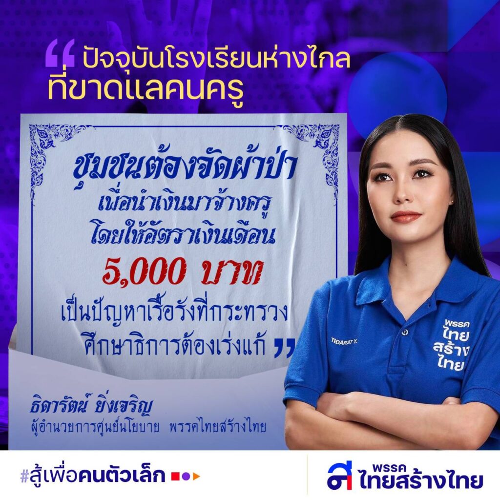 น.ส.ธิดารัตน์ ยิ่งเจริญ ผู้อำนวยการ ศูนย์นโยบาย พรรคไทยสร้างไทย กล่าวถึงกรณีที่มีประกาศรับสมัครครูอัตราจ้าง ระดับประถมศึกษา วิชาเอกภาษาไทย วุฒิปริญญาตรี ในอัตราเงินเดือน 5,000 บาท ของโรงเรียนแห่งหนึ่งในจังหวัดเชียงราย และก่อให้เกิดเสียงวิพากษ์วิจารณ์ตามมา เห็นได้ว่าโรงเรียนดังกล่าวขาดแคลนครูมาได้ซักระยะหนึ่งแล้ว