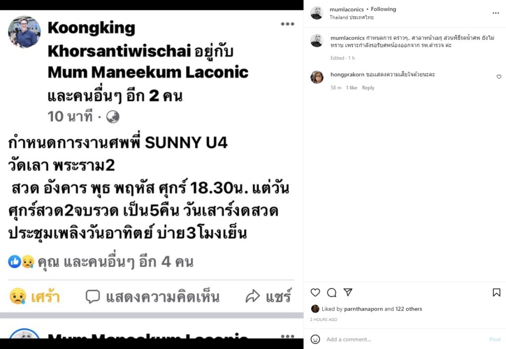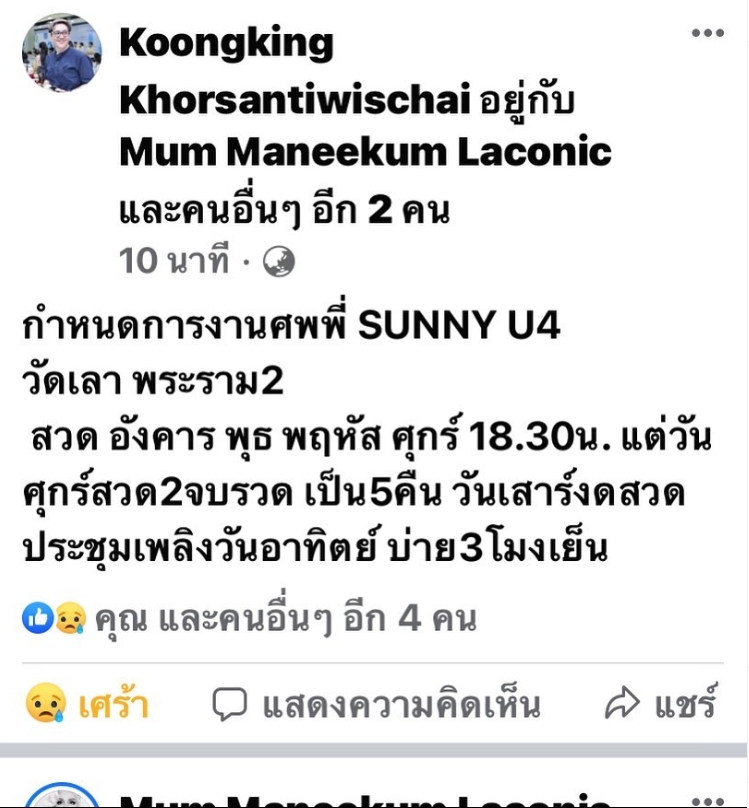 “มัม ลาโคนิค” เผยรอรับร่าง”ซันนี่ ยูโฟร์” จาก รพ. พร้อมแจ้งกำหนดพิธีสวดอภิธรรม
