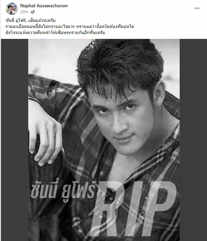 เรียกว่าเป็นข่าวช็อกวงการบันเทิง เมื่ออดีตนักร้องบอยแบรนด์ชื่อดังยุค 90 “ซันนี่ ยูโฟร์” หรือ “ญาณวรุตม์ สุทธิวาส” เสียชีวิตภายในคอนโดย่านวังทองหลาง และยังไม่มีการระบุสาเหตุการเสียชีวิตอย่างแน่ชัด โดยเพื่อนร่วมวงอย่าง “นิค ยูโฟร์” เป็นคนแจ้งข่าวเศร้า ท่ามกลางคนในวงการบันเทิงและแฟนๆได้โพสต์อาลัยอย่างมากมาย
