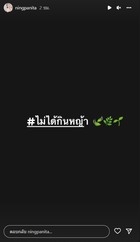 โดยเป็นภาพข้อความมีเนื้อหาว่า “สร้างภาพ PR จะวงการไหนก็ไม่ต่างกัน บางคนอยู่วงการไฮโซ แต่ทำตัวยิ่งกว่านี้” พร้อมกับติดแฮชแท็ก #ฝากไว้ให้ทบทวน #ยอมใจคนด้วย #ทีมหนิงไม่พูดเยอะ ก่อนจะปิดท้ายแบบรัวๆ ด้วยสัญลักษณ์อีโมจิมองบน ส่วนในอินสตาแกรมสตอรี่ หนิง ปณิตา ก็ได้โพสต์ข้อความสั้นๆ ว่า “#ไม่ได้กินหญ้า”