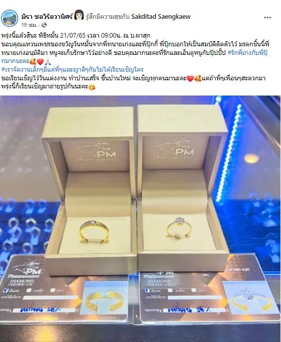 “พิธีหมั้น 21/07/65 เวลา 09:00 น. ณ บ.ผาสุก ขอบคุณแหวนเพชรของขวัญวันหมั้นจากพี่ทนายเก่งและพี่ปุ๊กกี้ พี่ปุ๊กบอกให้เป็นสมบัติติดตัวไว้ มรดกชิ้นนี้พี่ทนายเก่งอนุมัติมา หนูจะเก็บรักษาไว้อย่างดี ขอบคุณมากนะคะที่รักและเอ็นดูหนูกับปุ๊ปปั๊ป #รักพี่เก่งกับพี่ปุ๊กมากนะคะ