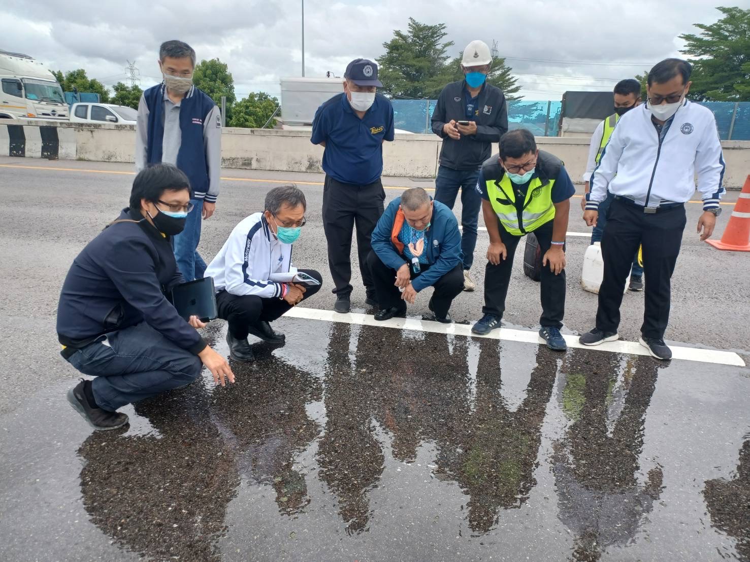 โดยรองอธิบดีกรมทางหลวง พร้อมทีมวิศวกรผู้เชี่ยวชาญจากส่วนกลาง และเจ้าหน้าที่แขวงทางหลวงธนบุรี ได้ลงพื้นที่บริเวณดังกล่าว ในวันพฤหัสที่ 21 กรกฎาคม 2565 เวลา 14:00 น. ร่วมกันดำเนินการตรวจสอบแล้ว พบรอยแตกร้าวและการหลุดร่อนที่แผ่นพื้นสำเร็จรูปที่ใช้สำหรับเป็นแบบเทพื้นสะพาน ที่ กม.4+176 (ขวาทาง) บนทางหลวงพิเศษหมายเลข 9 ช่วงด่านบางครุ – ด่านบางขุนเทียน (ขาเข้า)