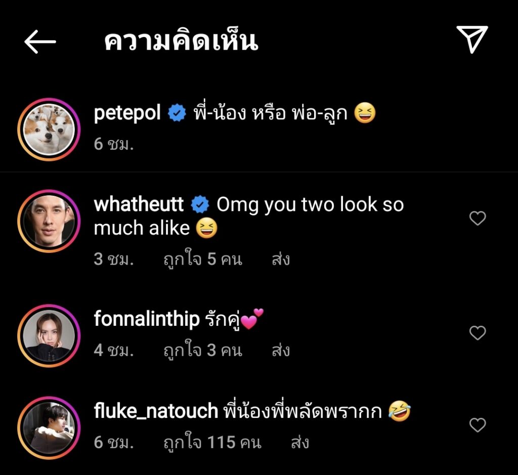 เมื่อ “พีท” ลงรูปคู่ “ฟลุ้ค” พร้อมแคปชั่น “พี่ – น้อง หรือ พ่อ – ลูก” น้องฟลุ้คก็เข้ามาตอบว่า “พี่น้องที่พลัดพราก🤣” เพราะทั้งคู่ดูเหมือนพี่น้องคลานตามกันมา ยิ่งยิ้มปุ๊บ!! แฟนๆ วางมือทาบอกร้องอุ๊ปส์!! เพราะรอยยิ้มเหมือนกันมากและยังบอกว่างานนี้คนคุณภาพมาเจอกันมันต้องปังแน่!