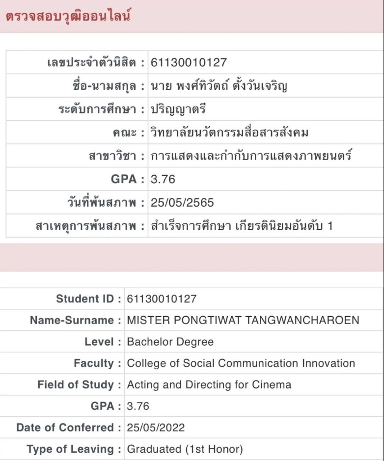 ทั้งหล่อ เก่ง! “บลู พงศ์ทวัตถ์” เรียนจบ ป.ตรี แถมคว้าเกียรตินิยมอันดับ 1 คนบันเทิง แฟนคลับ แห่ยินดี