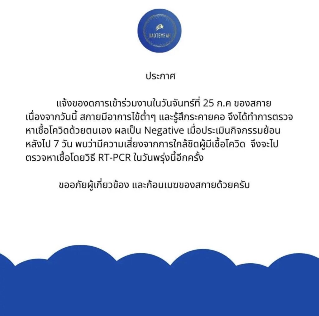 “แจ้งของดการเข้าร่วมงานในวันจันทร์ที่ 25 ก.ค. ของสกาย เนื่องจากวันนี้ สกายมีอาการไข้ต่ำๆ และรู้สึกระคายคอ จึงได้ทำการตรวจหาเชื้อโควิดด้วยตนเอง ผลเป็น Negative เมื่อประเมินกิจกรรมย้อนหลังไป 7 วัน พบว่ามีความเสี่ยงจากการใกล้ชิดผู้มีเชื้อโควิด จึงจะไปตรวจหาเชื้อโดยวิธี RT – PCR ในวันพรุ่งนี้อีกครั้งขออภัยผู้เกี่ยวข้อง และก้อนเมฆของสกายด้วยครับ”