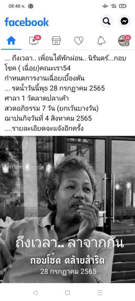 ทั้งนี้จะมีกำหนดการรดน้ำศพ วันที่ 28 กรกฎาคม 2565 ศาลา 1 วัดลาดปลาเค้า สวดอภิธรรม 7 วัน (ยกเว้นบางวัน) และมีพิธีฌาปนกิจในวันที่ 4 สิงหาคม 2565 รายละเอียดจะแจ้งให้ทราบอีกครั้ง