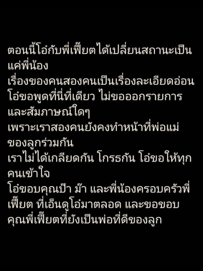 โดย โอ๋ โพสต์ระบุข้อความว่า “ตอนนี้โอกับพี่เฟี๊ยตได้เปลี่ยนสถานะเป็นแค่พี่น้อง เรื่องของคนสองคนเป็นเรื่องละเอียดอ่อน โอ๋ขอพูดที่นี่ที่เดียว ไม่ขอออกรายการ และสัมภาษณ์ใด ๆ เพราะเราสองคนยังคงทำหน้าที่พ่อแม่ของลูกร่วมกัน เราไม่ได้เกลียดกัน โกรธกัน โอ๋ขอให้ทุกคนเข้าใจ โอ๋ขอบคุณป๊า ม๊า และพี่น้องครอบครัวพี่เฟี๊ยต ที่เอ็นดูโอ๋มาตลอด และขอขอบคุณพี่เฟี๊ยตที่ยังเป็นพ่อที่ดีของลูก”