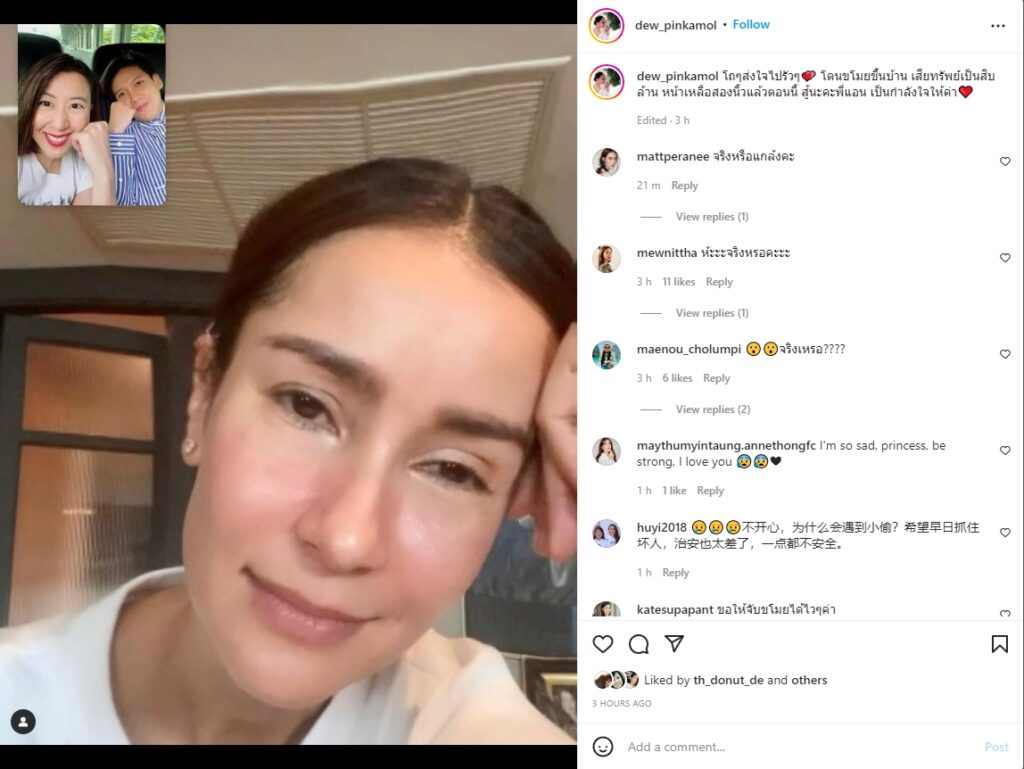 โดยทางด้าน “ดิว ปิ่นกมล มาลีนนท์” หนึ่งในผู้บริหารช่อง 3 ได้โพสต์ภาพขณะวิดีโอคลอกับ “แอน ทองประสม” พร้อมแคปชั่นว่า “โถๆ ส่งใจไปรัวๆ โดนขโมยขึ้นบ้าน เสียทรัพย์เป็นสิบล้าน หน้าเหลือสองนิ้วแล้วตอนนี้ สู้นะคะพี่แอน เป็นกำลังใจให้ค่า” ขณะที่ “มิว นิษฐา” ก็เข้ามาเมนต์ว่า “ห้ะ…จริงหรอคะ” ซึ่งเจ้าของโพสต์อย่างคุณดิวก็ตอบกลับ “จริงค่า”