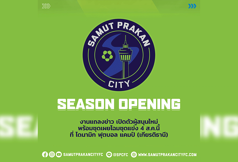 สมุทรปราการ ซิตี้ เตรียมแถลงข่าว เปิดตัวผู้สนับสนุนรายใหม่ พร้อมชุดเผยโฉมชุดแข่ง สู้ ศึก ไทยลีก 2 ฤดูกาล 2022 ในวันนื้ 4 ส.ค.นี้ ที่ ไดนามิก ฟุตบอล แคมป์ (เกียรติธานี)
