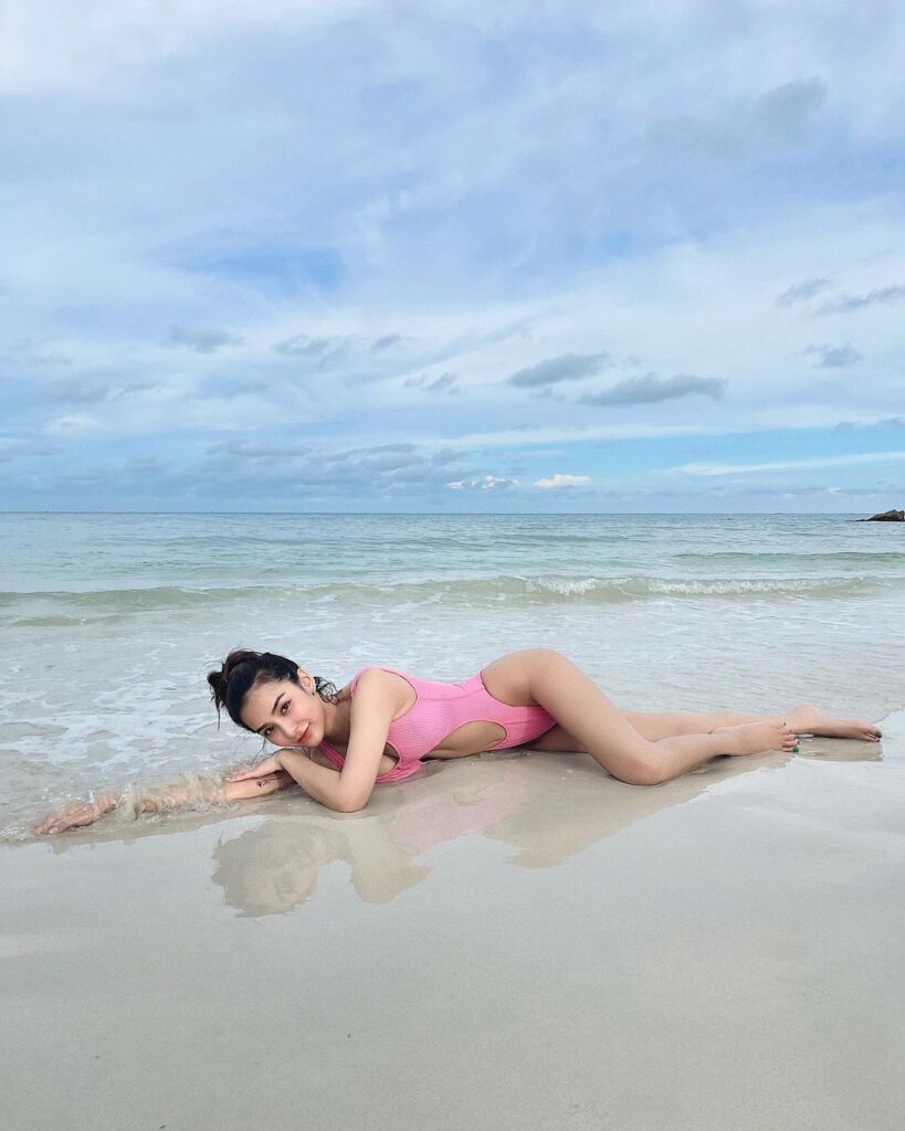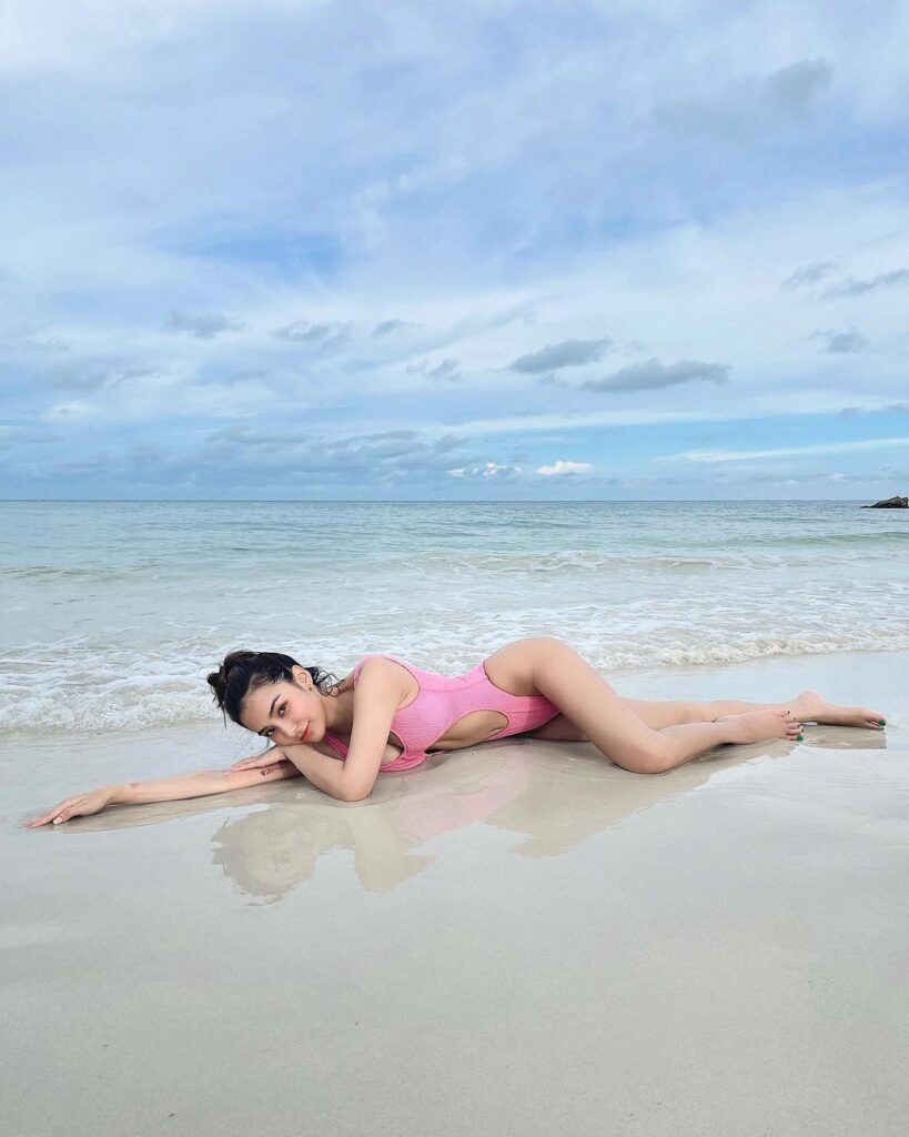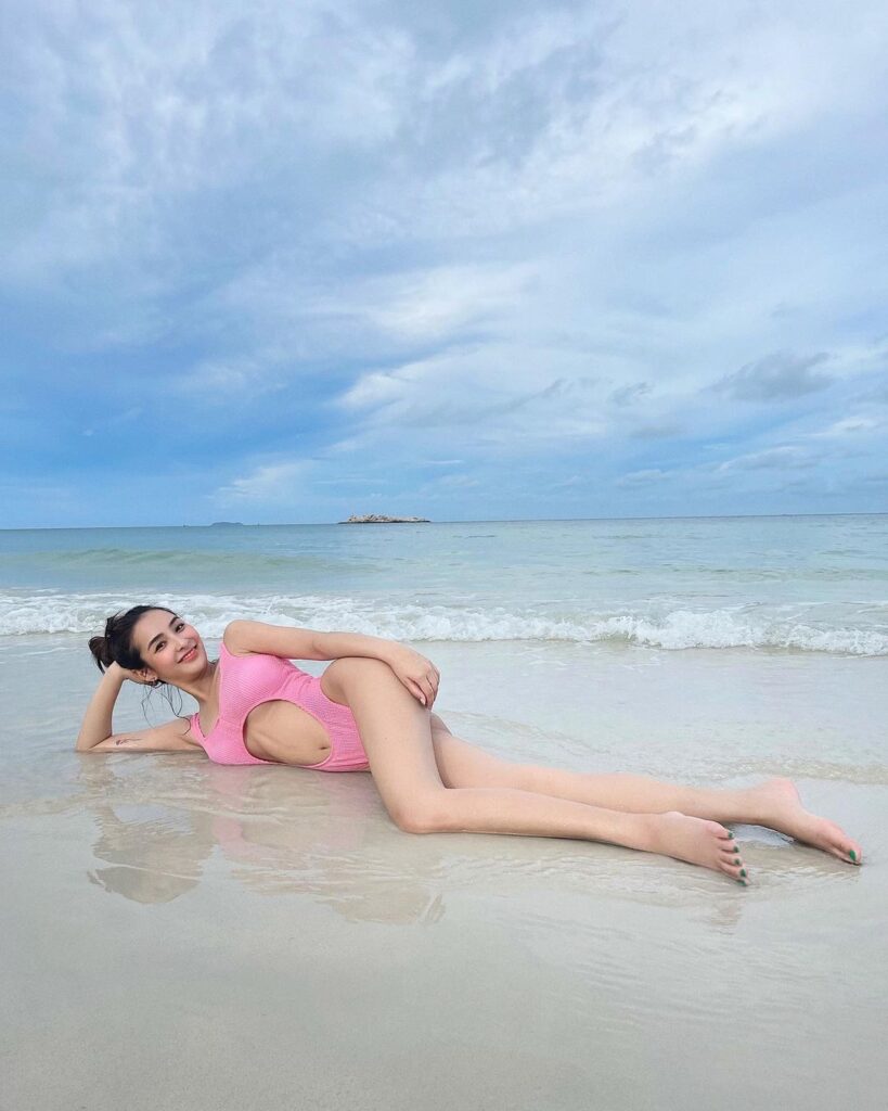 อย่างล่าสุดกับชุดวันพีชสีชมพูสดใส มีดีเทลแหวกช่วงท้อง โชว์ซิกแพ็กเบาๆ โชว์เนินอกขาว เรียวขายาว โพสท์ท่านอนอาบแดดริวชายหาด เซ็กซี่ยั่วๆ แย่งซีนวิวทะเลด้านหลังเต็มๆ พร้อมแปะแคปชั่นสุดน่ารักเอาไว้ว่า “ฉลามนะชอบงับคุณ งับๆ🤪”