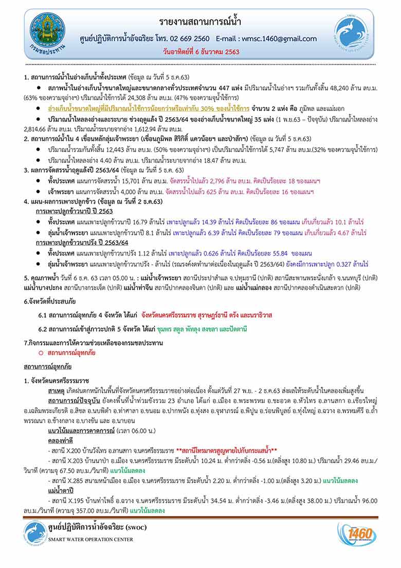 กรมชลประทาน รายงานข้อมูลผ่านทวิตเตอร์ กรมชลประทาน ถึงมาตรากการช่วยเหลือผู้ประสบอุทกภัยในพื้นที่ภาคใต้ จากเหตุการณ์ฝนตกหนักและคลื่นลมแรง ว่า สถานการณ์น้ำในวันนี้ (6 ธ.ค.63) พบว่าจังหวัดที่ประสบอุทกภัย ได้แก่ จังหวัดนครศรีธรรมราช สุราษฎร์ธานี ตรังและนราธิวาส ส่วนจังหวัดที่เข้าสู่ภาวะปกติ ได้แก่ ชุมพร สตูล พัทลุง สงขลา และปัตตานี