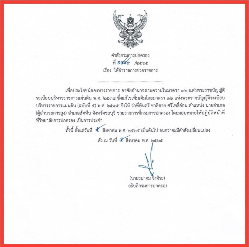 โดยหนังสือเป็นคำสั่งกรมการปกครอง ที่ 1441/2565 เรื่องให้ข้าราชการช่วยราชการ ความว่า เพื่อประโยชน์ของทางราชการ อาศัยอำนาจตามความในมาตรา 32 แห่งพระราชบัญญัติ