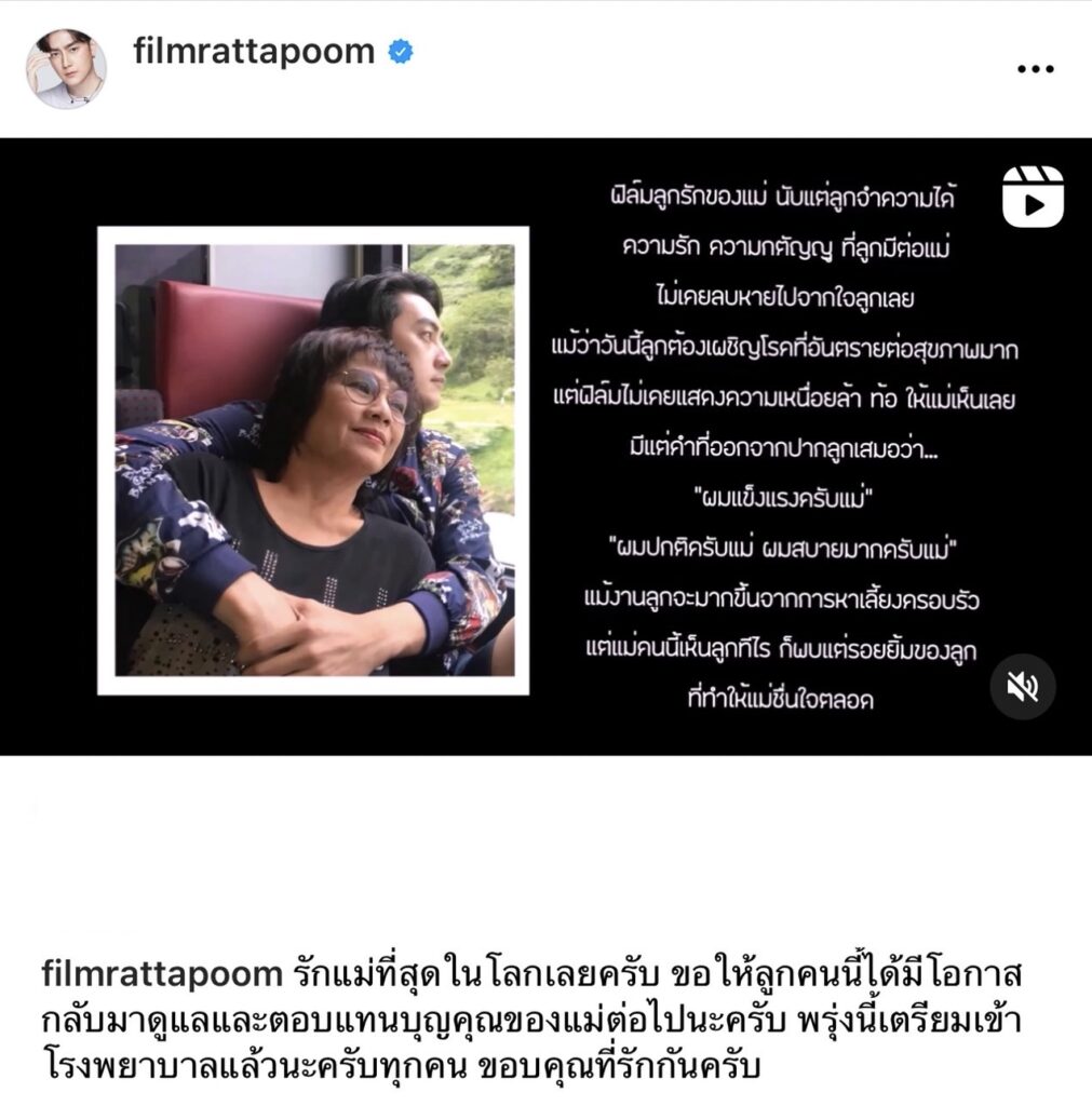 “ก่อนออกไปโรงพยาบาล กราบเท้าคู่เดิมที่ลูกกราบตั้งแต่เกิดและทำให้ผ่านมาได้ทุกอุปสรรค พอเห็นเท้าแม่แล้วทำให้ไม่กลัวอะไรเลย เพราะเท้าเล็กๆคู่นี้ ในวันนี้ก็เหี่ยวลงมากเพราะอายุและไม่เคยหยุดทำงาน วันแม่ปีนี้แม้ตัวต้องอยู่โรงพยาบาล ฟิล์มขอให้แม่สุขภาพแข็งแรงอยู่ให้ลูก กราบ ไหว้ แบบนี้ในทุกๆวันนะครับ รักแม่ครับ”