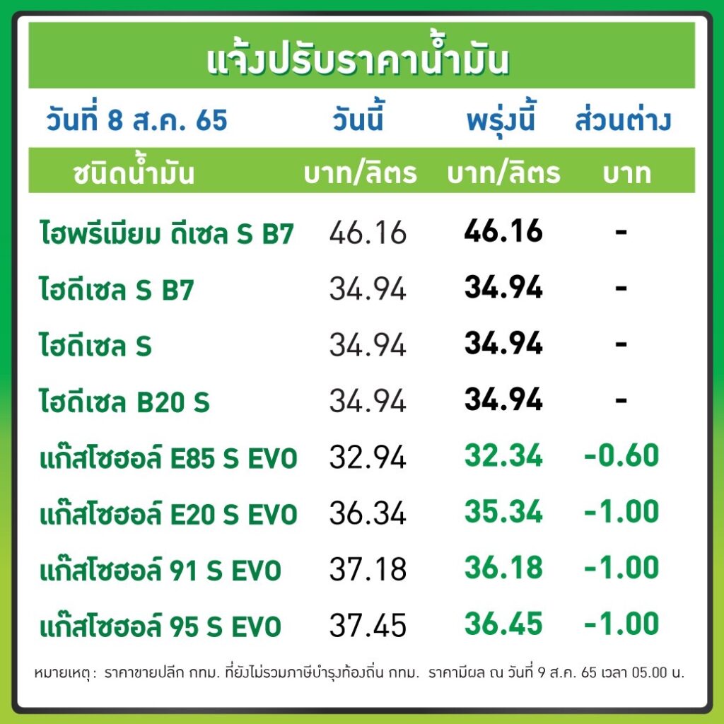 บริษัท ปตท.น้ำมันและการค้าปลีก จำกัด (มหาชน) (OR) และ บริษัท บางจาก คอร์ปอเรชั่นจำกัด (มหาชน) (BCP) ประกาศปรับลดราคาขายปลีกน้ำมันกลุ่มเบนซินและแก๊สโซฮอล์ทุกชนิด 1 บาท/ลิตร เว้น E85 ลดลง 60 สต./ลิตร ส่วนกลุ่มดีเซลคงเดิม มีผล 9 ส.ค. 2565 เวลา 05.00 น. เป็นต้นไป