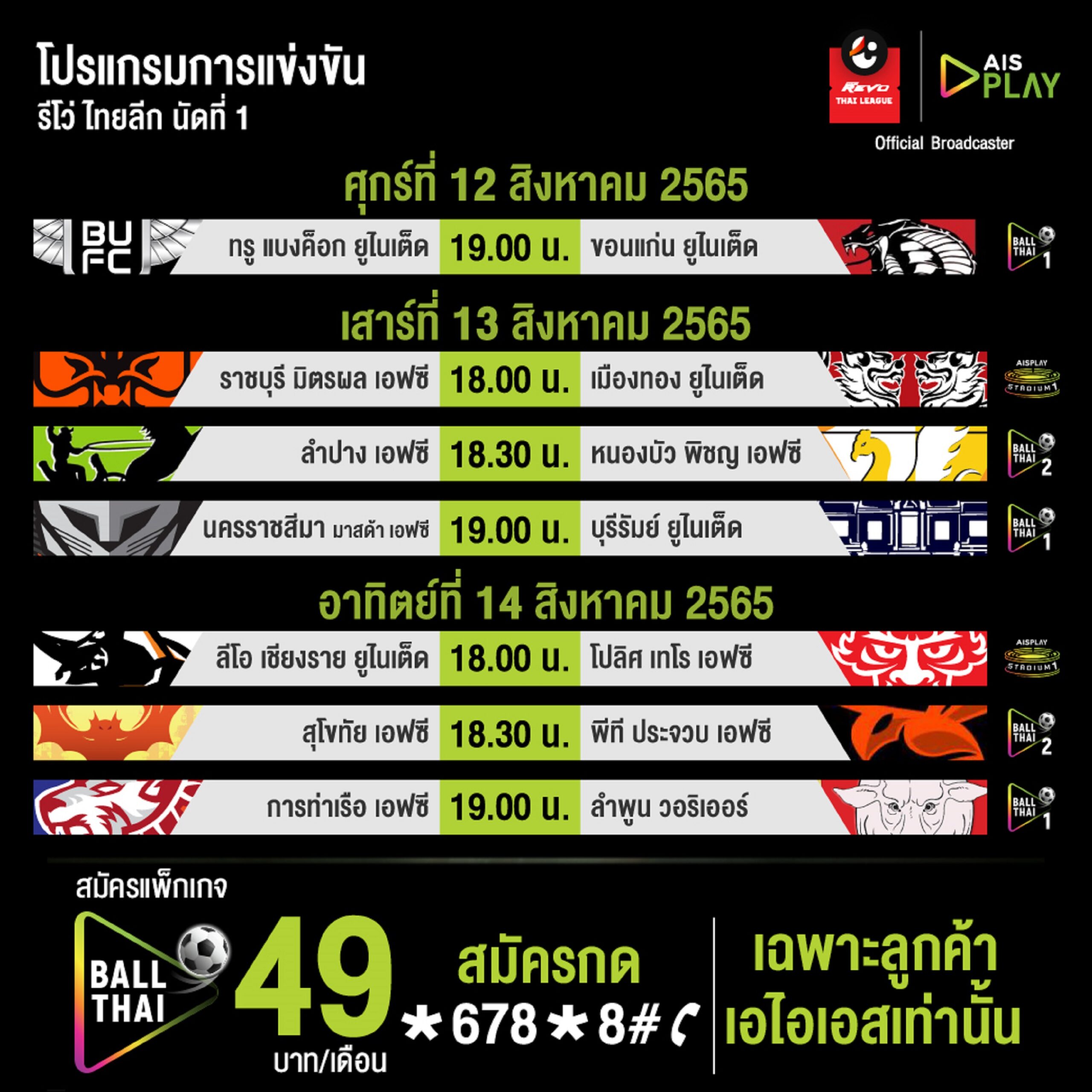 มาร่วมชมและเชียร์นักเตะที่ชื่นชอบรวมทั้งสโมสรที่รักในศึกฟุตบอลรีโว่ ไทยลีก ฤดูกาล 2022-2023 นี้ไปพร้อมกัน โดยนัดเปิดสนาม แบงค้อก ยูไนเต็ด จะเปิดบ้านต้อนรับการมาเยือนของขอนแก่น ยูไนเต็ด โดยเริ่มคิกออฟในเวลา 19.00 น. สำหรับคู่บิ๊กประจำสัปดาห์ นครราชสีมา เจอศึกหนักเมื่อต้องเปิดบ้านต้อนรับแชมป์เก่าอย่างบุรีรัมย์ ยูไนเต็ด
