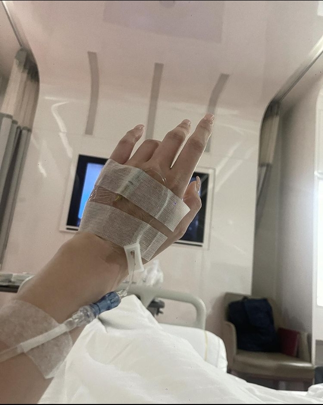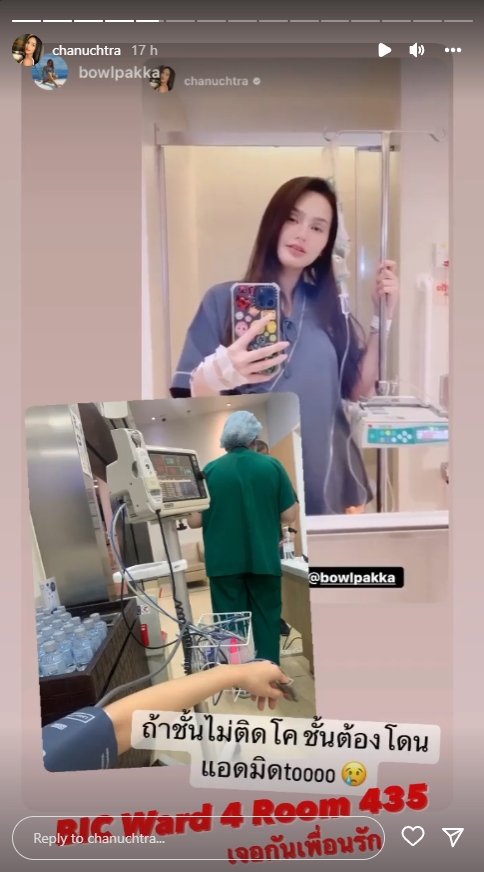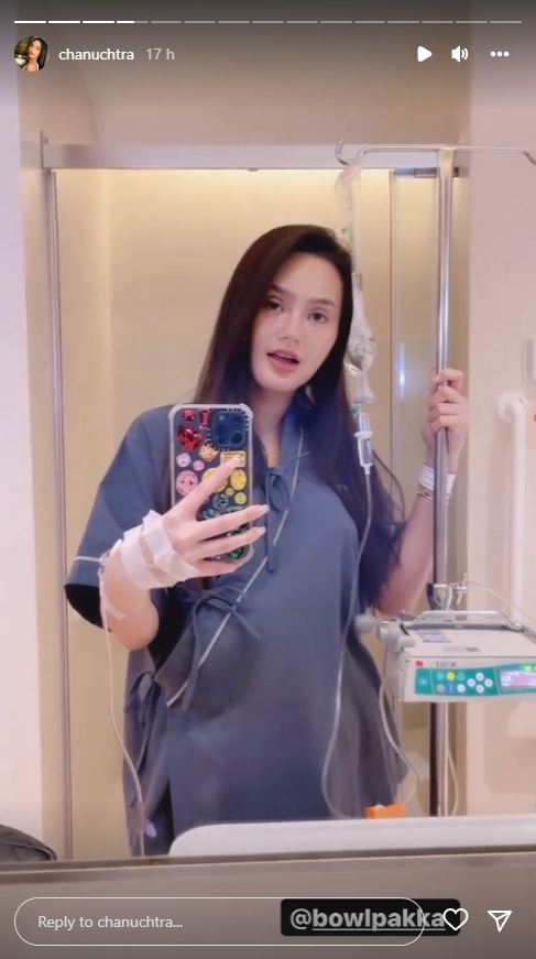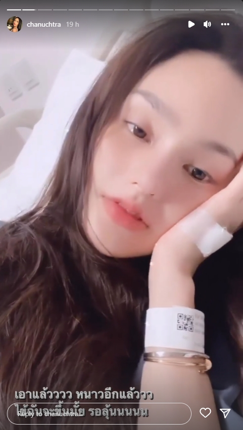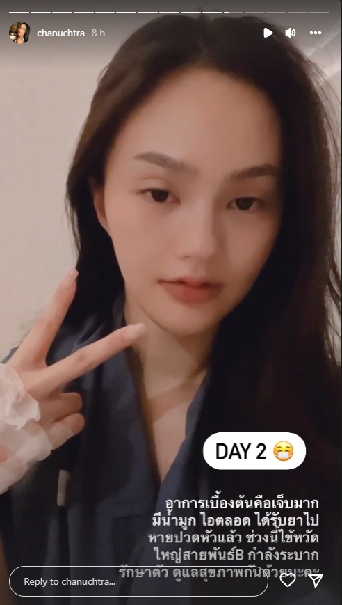 พร้อมทั้งอัปเดตอาการผ่านไอจีสตอรี่ ด้วยภาพขณะที่กำลังรักษาตัวอยู่โรงพยาบาลให้ได้ชมด้วยแคปชั่นว่า “วันที่ 2 อาการเบื้องต้นคือเจ็บคอมาก มีน้ำมูก ไอตลอด ได้รับยาไปหายปวดหัวแล้ว ช่วงนี้ไข้หวัดใหญ่สายพันธุ์ B กำลังระบาด รักษาตัว ดูแลสุขภาพกันด้วยนะคะ”