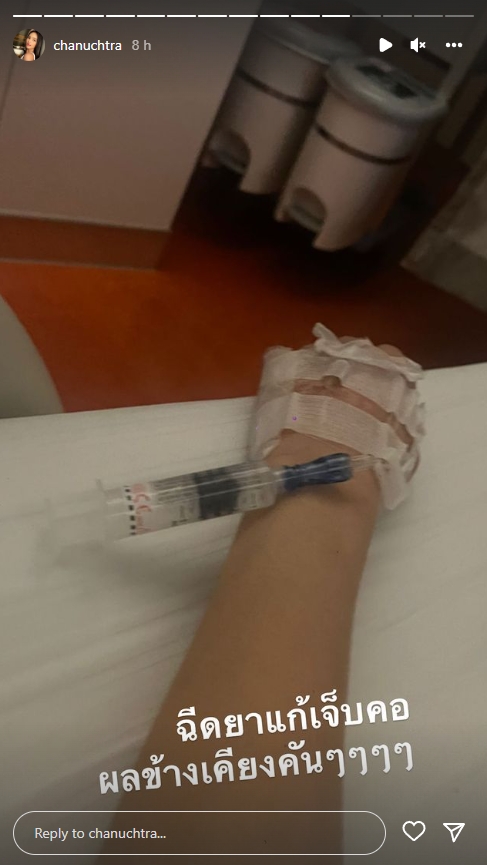 ก่อนที่ต่อมาสาวเจ้าจะโพสต์อีกภาพ ซึ่งเป็นภาพขณะที่กำลังฉีดยา และแปะแคปชั่นบอกว่า “ฉีดยาแก้เจ็บคอ ผลข้างเคียงคันๆๆๆๆ”