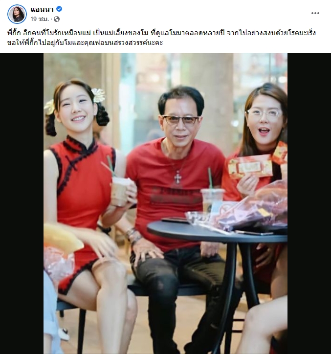 โดย “แอนนา” ได้โพสต์เผยภาพแตงโมครั้งที่ยังมีชีวิตถ่ายภาพร่วมเฟรม กับคุณพ่อโสภณ และ พี่กิ๊ก แม่เลี้ยงแตงโม พร้อมข้อความระบุไว้ว่า “พี่กิ๊ก อีกคนที่โมรักเหมือนแม่ เป็นแม่เลี้ยงของโม ที่ดูแลโมมาตลอดหลายปี จากไปอย่างสงบด้วยโรคมะเร็ง ขอให้พี่กิ๊กไปอยู่กับโมและคุณพ่อบนสรวงสวรรค์นะคะ”