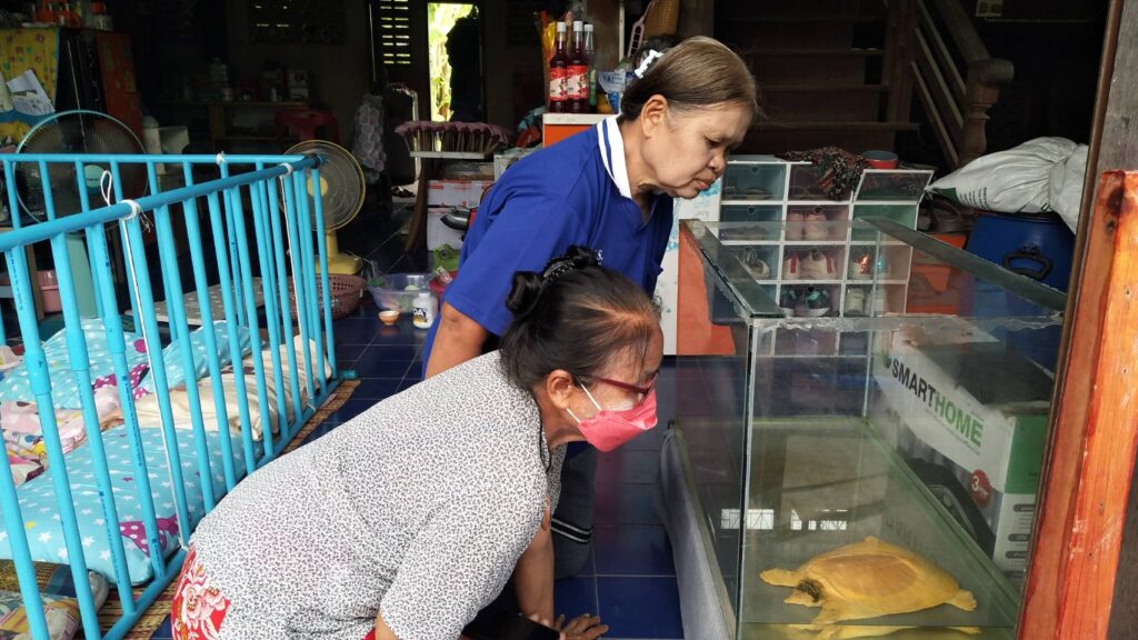 ปรากฏว่า ได้พบตะพาบสีเหลืองทอง ขนาดประมาณฝ่ามือผู้ใหญ่ หนักประมาณ 1 กิโลกรัม ในชีวิตไม่เคยพบเห็นมาก่อน จึงนำมาเลี้ยงไว้ โดยนำมาใส่ในตู้กระจกและให้อาหารเป็นเนื้อสดๆ
