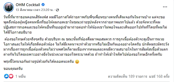 ล่าสุด “โอม ค็อกเทล” ได้โพสต์ชี้แจงผ่านเฟซบุ๊คส่วนตัว ถึงเหตุการณ์ดังกล่าวว่า