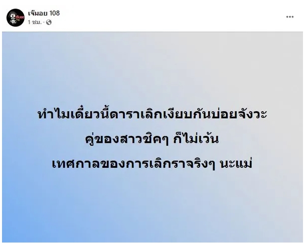 เรียกว่าเป็นเทศกาลของการเลิกราจริง ๆ สำหรับคนในแวดวงการบันเทิง ล่าสุด เพจดังอย่าง เจ๊มอย 108 ก็ออกมาปล่อยประเด็นร้อน ให้ชาวโซเชี่ยลได้ทำการบ้านกันอีกแล้ว หลังหย่อนคำใบ้ มีคู่รักเลิกเงียบๆ อีกคู่ โดยลงข้อความว่า