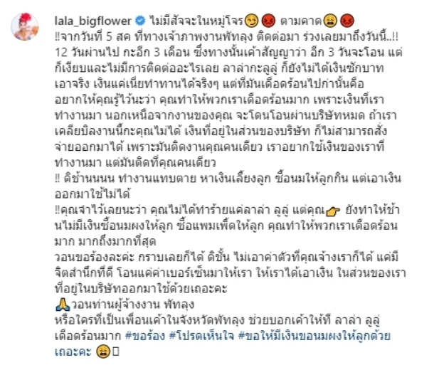 ดิช้านนนน ทำงานแทบตาย หาเงินเลี้ยงลูก ซื้อนมให้ลูกกิน แต่เอาเงินออกมาใช้ไม่ได้‼ คุณจำไว้เลยนะว่า คุณไม่ได้ทำร้ายแค่ลาล่า ลูลู่ แต่คุณ ยังทำให้ช้านไม่มีเงินซื้อนมผงให้ลูก ซื้อแพมเพิสให้ลูก คุณทำให้พวกเราเดือดร้อนมาก มากถึงมากที่สุดวอนขอร้องละค่ะ กราบเลยก็ได้ ดิชั้น ไม่เอาค่าตัวที่คุณจ้างเราก็ได้ แค่มีจิตสำนึกที่ดี โอนแค่ค่าเปอร์เซ็นต์มาให้เรา ให้เราได้เอาเงิน ในส่วนของเรา ที่อยู่ในบริษัทออกมาใช้ด้วยเถอะคะ วอนท่านผู้จ้างงาน พัทลุง หรือใครที่เป็นเพื่อนเค้าในจังหวัดพัทลุง ช่วยบอกเค้าให้ที ลาล่า ลูลู่ เดือดร้อนมาก #ขอร้อง #โปรดเห็นใจ #ขอให้มีเงินขอนมผงให้ลูกด้วยเถอะคะ”