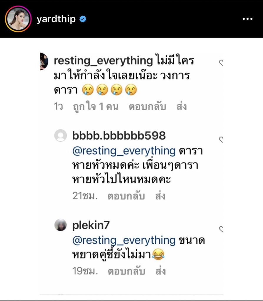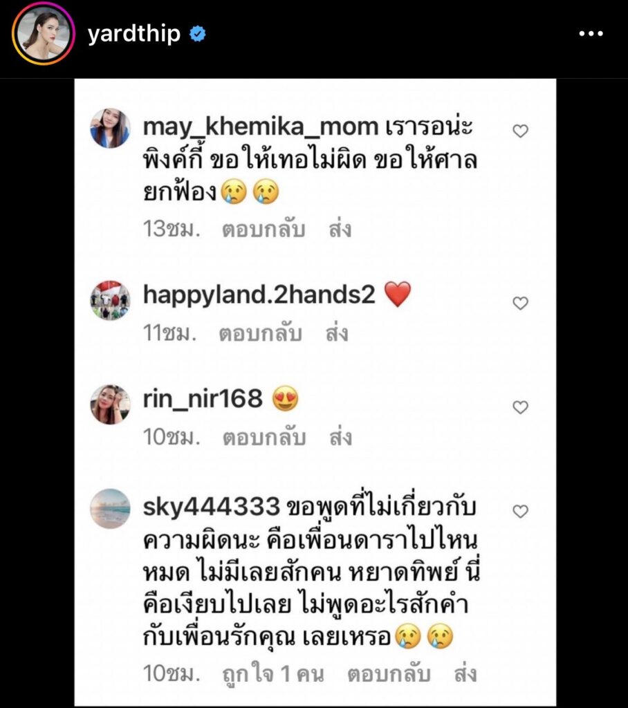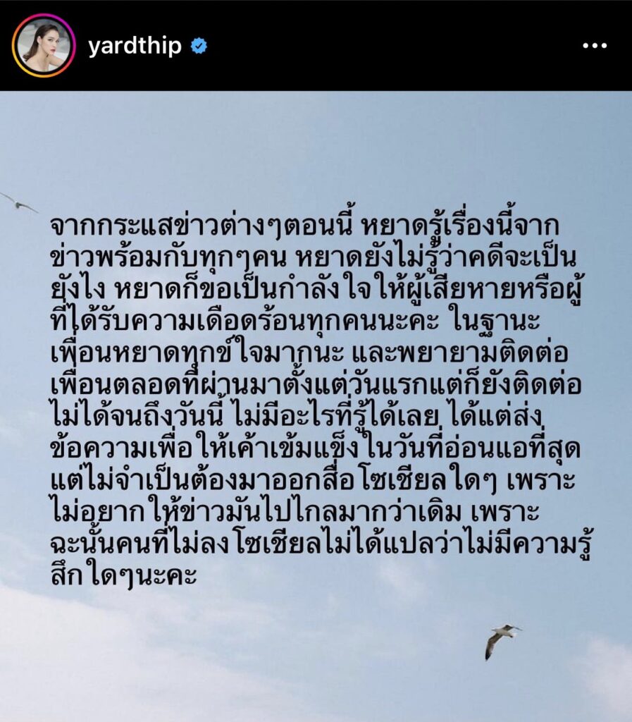 “จากกระแสข่าวต่างๆตอนนี้ หยาดรู้เรื่องนี้จากข่าวพร้อมกับทุกๆคน ยาดยังไม่รูว่าคดีจะเป็นยังไง หยาดขอเป็นกำลังใจ ให้ผุ้เสียหายหรีอผู้ที่ได้รับความเดือดร้อนทุกคนนะคะ ในฐานะเพื่อนหยาดทุกข์ใจมากนะ และพยายามติดต่อเพื่อนตลอดที่ผ่านมาตั้งแต่วันแรกแต่ก็ยังติดต่อไม่ได้จนถึงวันนี้ ไม่มีอะไรที่รู้ได้เลย ได้แต่ส่งข้อความเพื่อให้เค้าเข้มแข็งในวันที่อ่อนแอที่สุด แต่ไม่จำเป็นต้องมาออกสื่อโซเชียลใดๆเพราะไม่อยากให้ข่าวมันไปไกลกว่าเดิม เพราะฉะนั้นคนที่ไม่ลงโซเชียลไม่ได้แปลว่าไม่มีความรู้สึกใดๆนะคะ”