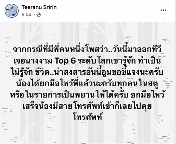 -ใช่ค่ะ แล้วก็มีคนที่ยืนยันด้วยที่เป็นทีมงานที่เห็นว่าเราได้ยกมือไหว้ เเละยังมีบุคคลแวดล้อมที่อยู่ในนั้นก็เห็นว่าเราไม่ได้ทำกิริยาแบบนั้นจริงๆ เพราะทางบ้านของเราก็ได้สอนมารยาทเหมือนกัน และยิ่งวงการบันเทิงแล้วเจอใครไม่ว่าจะอายุน้อยกว่าหรือว่าเจอใครเยอะแยะมากมาย แม้กระทั่งแม่บ้านเองก็ยังยกมือไหว้ทุกคน แล้วก็ยกมือไหว้ตลอดอยู่แล้วด้วย