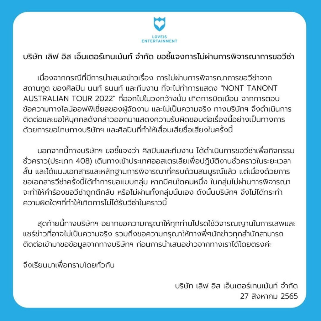 ล่าสุด บริษัท เลิฟ อิส เอ็นเตอร์เทนเม้นท์ จำกัด ต้นสังกัดของ “นนท์ ธนนท์” ได้ออกจดหมายชี้แจงถึงเรื่องนี้โดยระบุว่า ข่าวที่ออกมาเกิดการบิดเบือน จากการตอบข้อความทางไลน์ออฟฟิเชียลของผู้จัดงาน และไม่เป็นความจริง บรัทได้ติดต่อขอให้บุคคลดังกล่าวออกมาแสดงความรับผิดชอบต่อเรื่องนี้อย่างเป็นทางการด้วยการขอโทษบริษัท และศิลปิน ที่ทำให้เสื่อมเสียชื่อเสียง