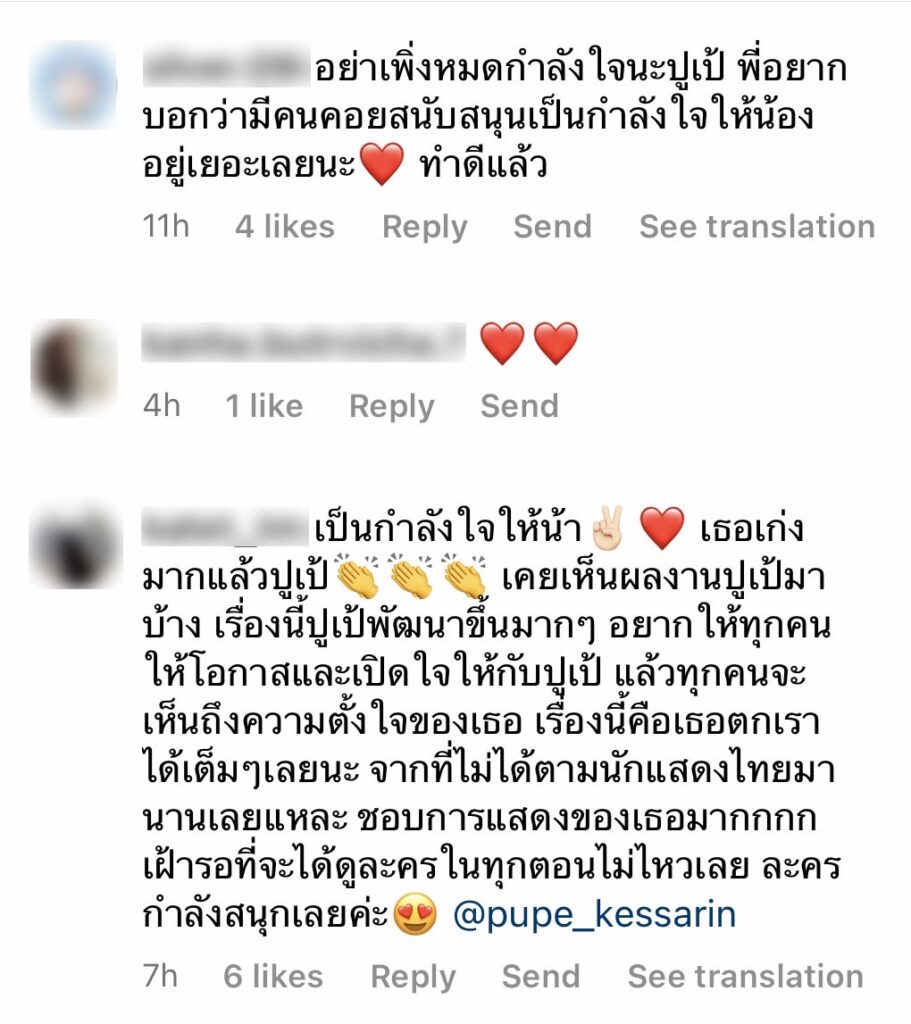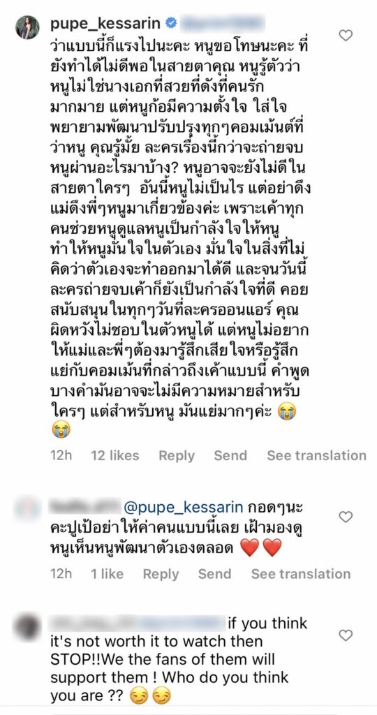 งานนี้ “ปูเป้” มาคอมเมนต์ตอบกลับ พร้อมกับเผยความรู้สึก “ว่าแบบนี้แรงไปนะคะ หนูขอโทษนะคะ ที่ยังทำได้ไม่ดีพอในสายตาคุณ หนูรู้ตัวว่าหนูไม่ใช่นางเอกที่สวยที่ดังที่คนรักมากมาย แต่หนูก็มีความตั้งใจใส่ใจ พยายามพัฒนาปรับปรุงทุกๆ คอมเมนต์ที่ว่าหนู”