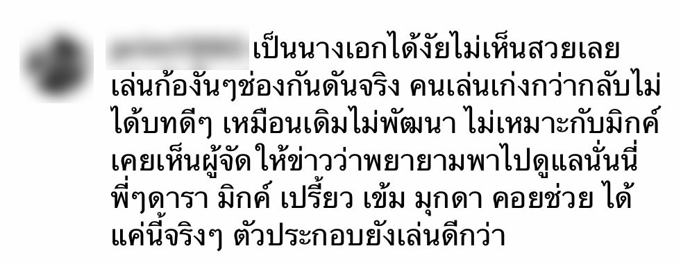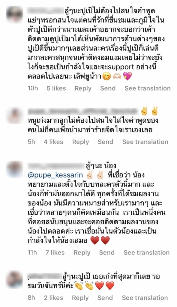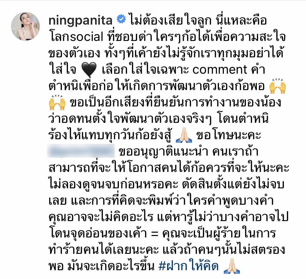 “ และจนวันนี้ละครถ่ายจบเขาก็ยังเป็นกำลังใจที่ดี คอยสนับสนุนในทุกๆ วันที่ละครออนแอร์ คุณผิดหวังไม่ชอบในตัวหนูได้ แต่หนูไม่อยากให้แม่และพี่ๆ ต้องมารู้สึกเสียใจและรู้สึกแย่กับคอมเม้นต์ที่กล่าวถึงเขาแบบนี้ คำพูดบางคำมันอาจจะไม่มีความหมายสำหรับใครๆ แต่สำหรับหนูมันแย่มากๆ ค่ะ”