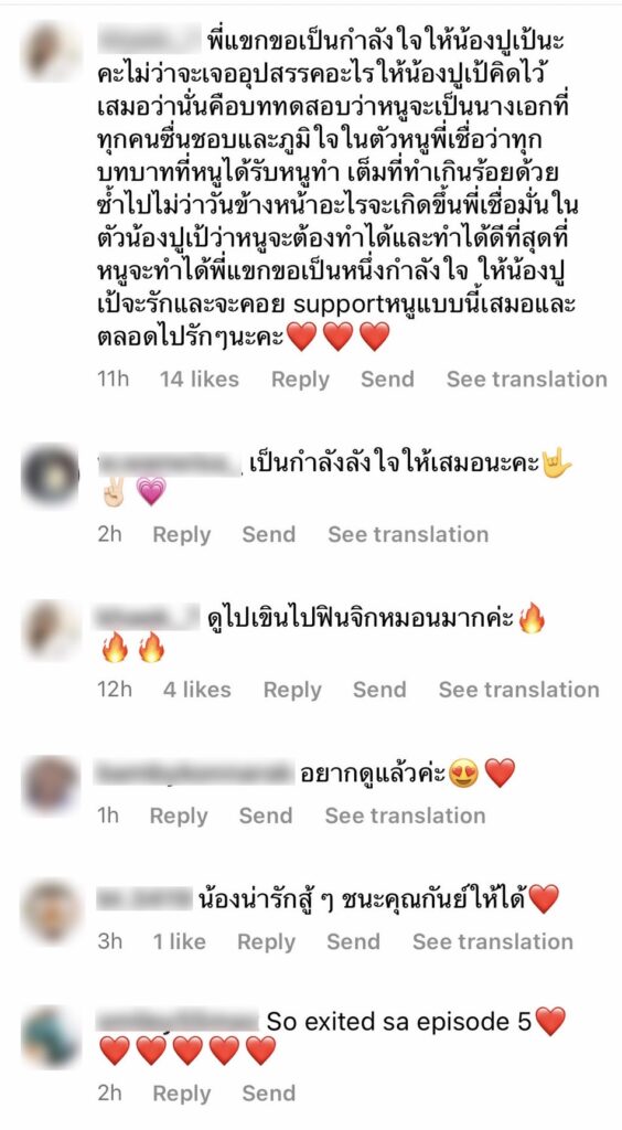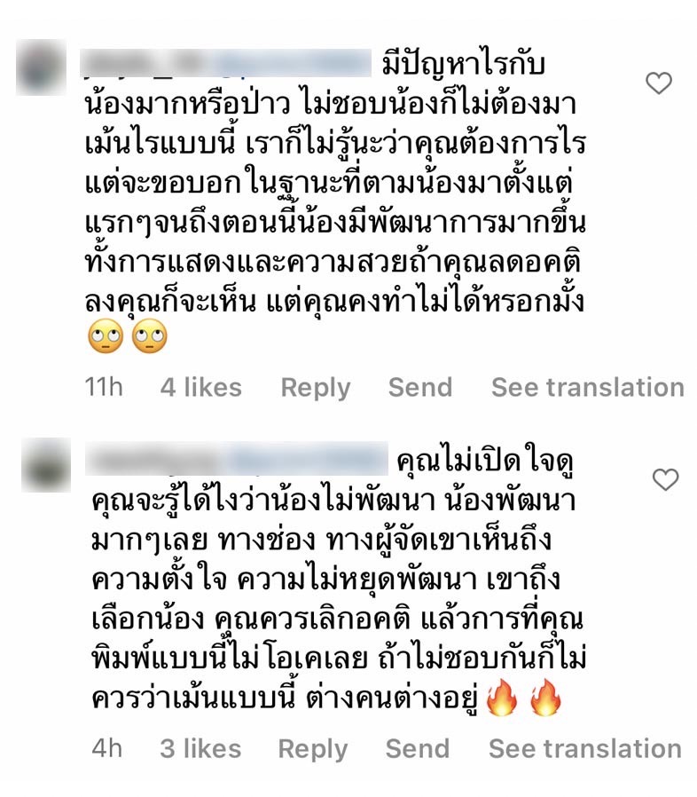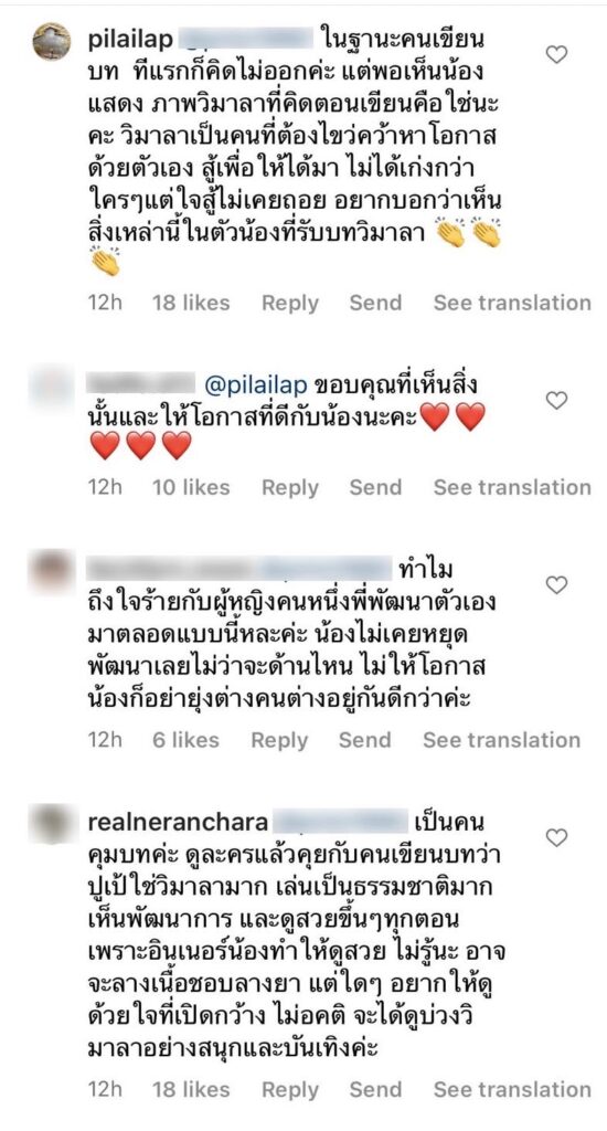 ฟากผู้จัด หนิง-ปณิตา, ผู้กำกับ ต่อ-ศุภฌา และคนเขียนบท พิไลลาพย์ ต่างเข้ามาคอมเมนต์เช่นกัน ข้อความประมาณว่า ไม่ต้องเสียใจ เลือกใส่ใจเฉพาะคอมเมนต์ที่ติเพื่อก่อและขอเป็นอีกเสียงที่ยืนยันการทำงานของน้องว่าอดทนตั้งใจพัฒนาตัวเองจริงๆ โดนตำหนิร้องไห้ทุกวันก็ยังสู้ ไม่ลองดูจนจบก่อนเหรอคะ งานนี้ยังมีแฟนๆ เข้ามาให้กำลังใจมากมาย โดยอยากให้ “เปิดใจ” ไม่ใช่ “อคติ”