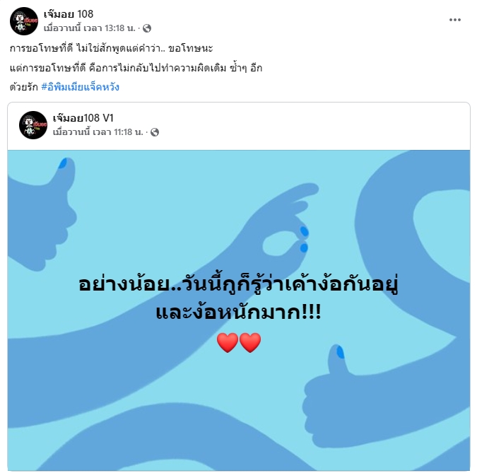 ต่อมาทาง เจ๊มอย 108 ได้แชร์โพสต์ของตัวเองอีกครั้ง พร้อมกับเขียนระบุข้อความว่า