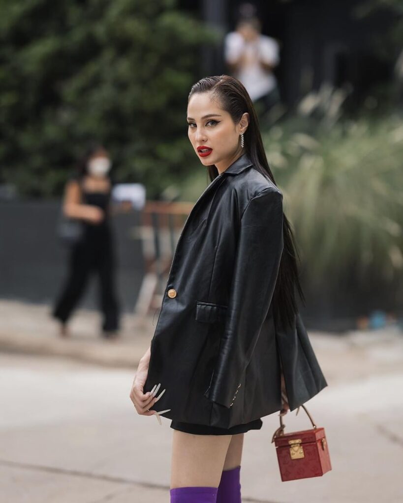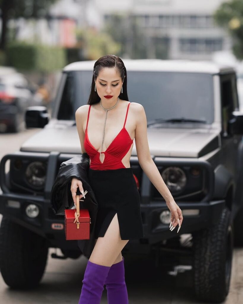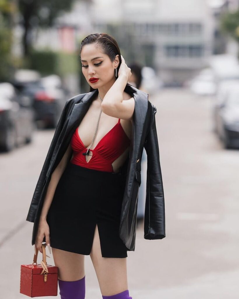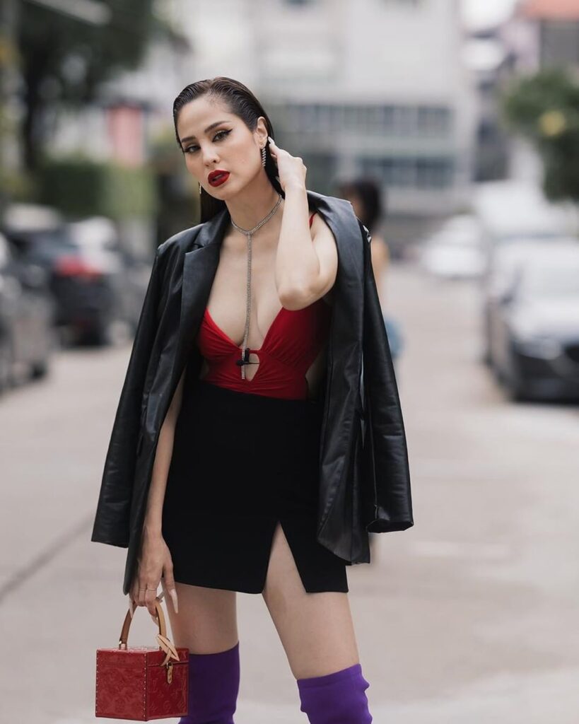 ล่าสุดขอสวยแบบเชิ่ด เหมือนแจ้งเกิดในวงการใหม่ๆ ด้วยการสาดความเซ็กซี่ แซ่บซี๊ดแบบพริกยกสวน กับเสื้อสายเดี่ยวสีแดงสด โชว์ผิวขาวโอโม่แสบตา กับกระดปรงสั้นสีดำ ตัดกับเสื้อสายเดี่ยว และรองเท้าบูทสีม่วง เพิ่มดีกรีความหรูหราด้วยแจ็คเก็ตหนังสีดำ สวยเลอค่า สมราคานางเอกเบอร์ต้นๆของเมืองไทย ไม่น้อยไป ไม่มากไป มองแล้วทำหนุ่มๆใจสั่นไม่เบาเลยทีเดียว
