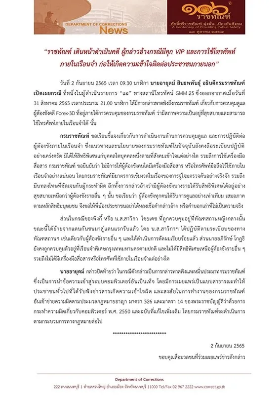 จากรณีที่ พิธีกรรายการดแฉ ซึ่งออกอากาศเมื่อวันที่ 31 สิงหาคม 2565 ได้มีการกล่าวพาดพิงถึงกรมราชทัณฑ์ เกี่ยวกับการควบคุมดูแลผู้ต้องขังคดี Forex-3D ว่ามีสภาพความเป็นอยู่ที่สุขสบาย และสามารถใช้โทรศัพท์ภายในเรือนจำได้นั้น