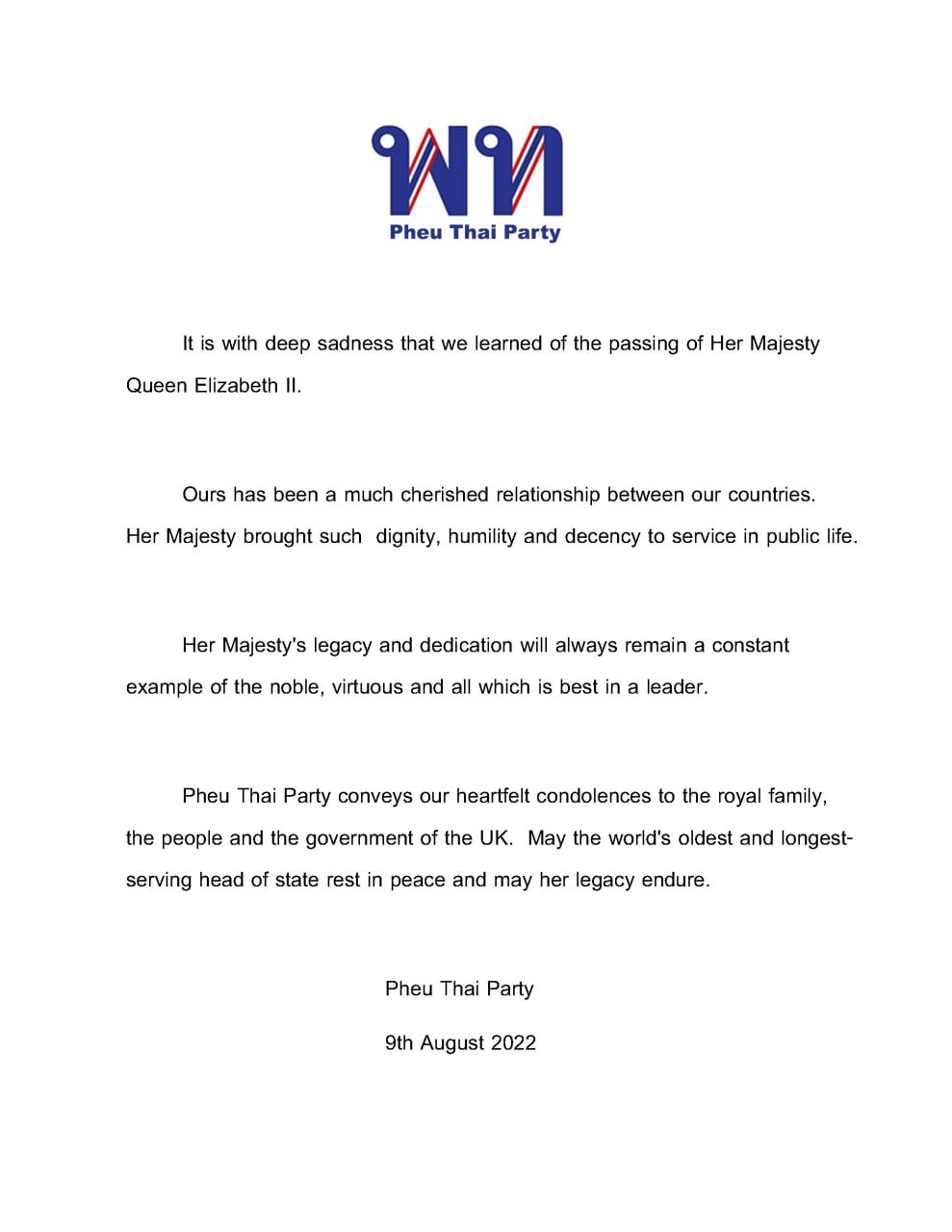 พรรคเพื่อไทยขอถวายความอาลัยไปยังพระบรมวงศานุวงศ์แห่งสหราชอาณาจักรทุกพระองค์ และขอแสดงความเสียใจอย่างสุดซึ้งต่อประชาชนและรัฐบาลสหราชอาณาจักร และขอให้สมเด็จพระราชินีนาถเอลิซาเบธที่ 2 ประมุขแห่งรัฐผู้ทรงครองราชย์ยาวนาน เสด็จสู่สวรรคาลัยนิรันดร์