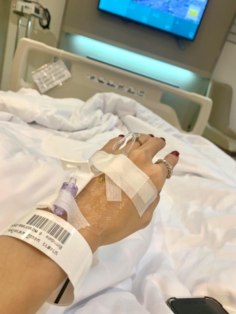 “เสร็จจากคอนเสิร์ตก็มาแอดมิทเลย… ไอจนเจ็บหน้าอกมาเป็นเดือนแล้ว ผลเลือด ค่าตับ ค่าไต ทุกอย่างปกติหมด มีปอดอักเสบ เกิดจากอาการ ล อ ง โ ค วิ ด ในขณะที่ฉันแอดมิท พี่สาวฉันก็บอกว่า มาร์คหน้าเลย จะได้ไม่โทรม เดี๋ยวพรุ่งนี้มารับ ไปงาน”