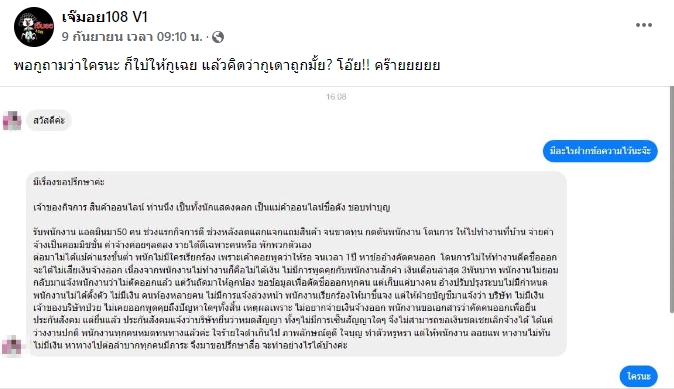 “มีเรื่องขอปรึกษาค่ะ เจ้าของกิจการ สินค้าออนไลน์ ท่านนึง เป็นทั้งนักแสดงตลก เป็นแม่ค้าออนไลน์ชื่อดัง ชอบทำบุญ รับพนักงาน แอดมินมา 50 คน ช่วงแรกกิจการดี ช่วงหลังลดแลกแจกแถมสินค้า จนขาดทุน กดดันพนักงาน โดยการ ให้ไปทำงานที่บ้าน จ่ายค่าจ้างเป็นคอมมิชชั่น ค่าจ้างค่อยๆลดลง รายได้ดีเฉพาะคนหรือพรรคพวกตัวเอง