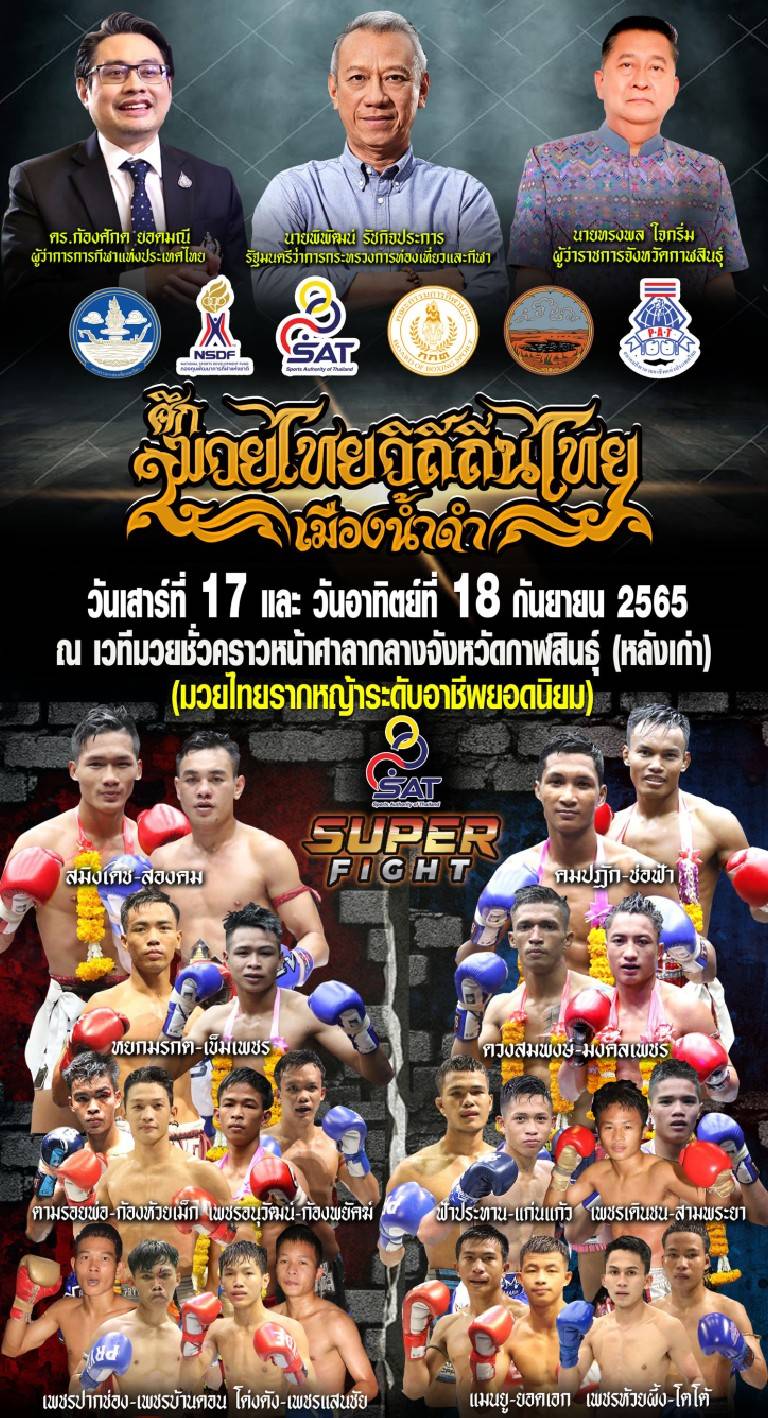 สำหรับรายการ ศึกมวยไทยวิถีถิ่นไทย เมืองน้ำดำ ได้จัดขึ้นเพื่อรณรงค์การท่องเที่ยวจังหวัดกาฬสินธุ์ โดยไฮไลท์วันเสาร์ที่ 17 ก.ย. คู่เอก สมิงเดช น.อนุวัฒน์ยิมส์ มวยซ้ายสูงยาวฝีมืออาวุธครบเครื่องดวลเดือดครั้งแรกกับ สองคม บางกอกอะไหล่ยนต์ มวยขวาหมัดหนักศอกอันตราย ส่วนคู่รอง หยกมรกต ว.สังข์ประไพ มวยซ้ายฉลาดหลักเหลี่ยมดวลกับ เข็มเพชร ว.ไพรอนันต์ สูงยาวเข่าแหลม