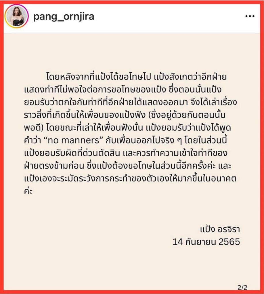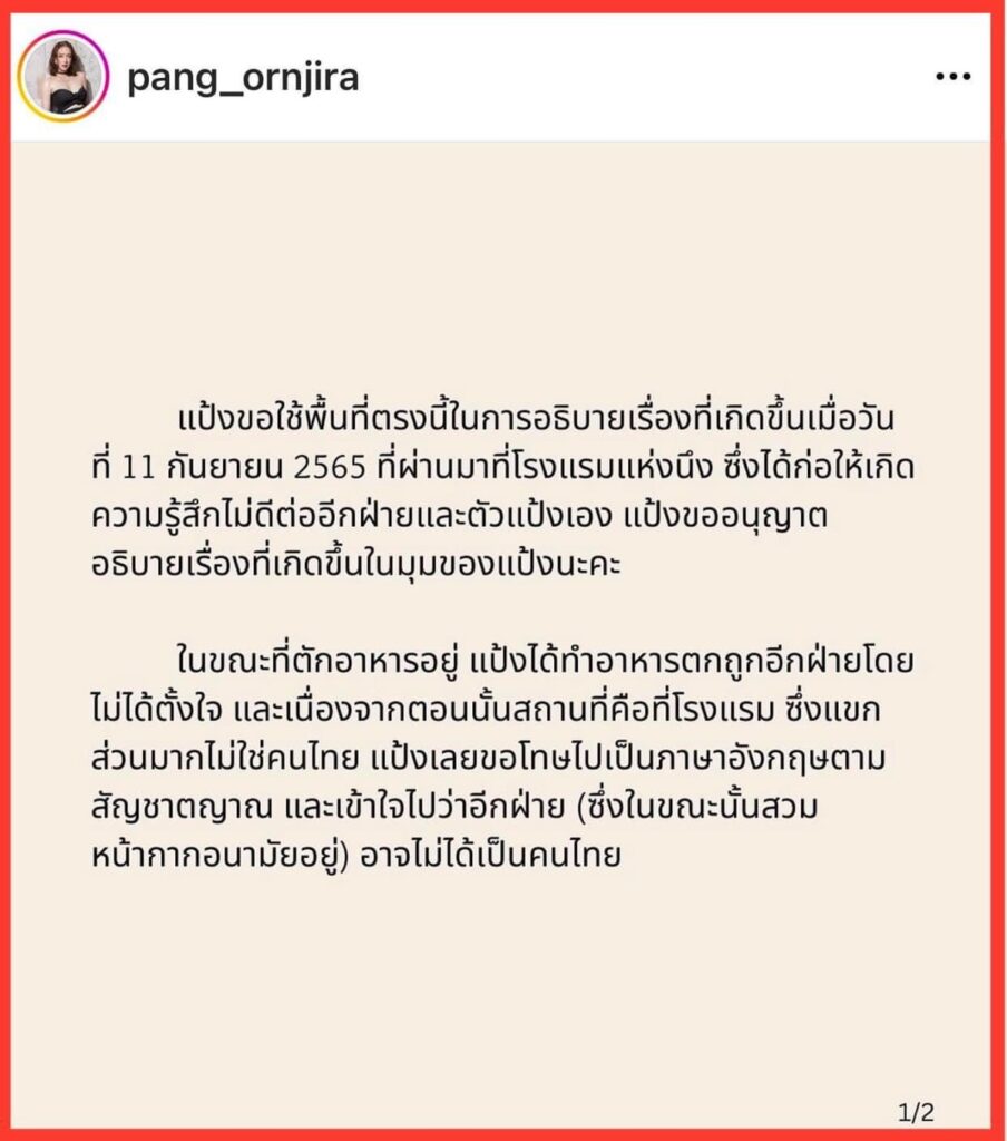 ล่าสุด แป้ง อรจิรา ได้โพสต์ชี้แจงเรื่องดังกล่าวผ่านอินสตาแกรมส่วนตัว พร้อมขอโทษคู่กรณี รับด่วนตัดสินใจกับท่าทีอีกฝ่าย และไม่คิดว่าเป็นคนไทย ต่อไปจะระมัดระวังการกระทำของตนเองให้มากขึ้น