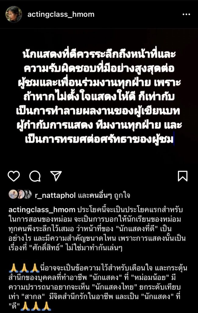 โดยในอินสตาแกรมของ “หม่อมน้อย” ได้มีการโพสต์ข้อความ คำสอนถึงการเป็นนักแสดงที่ดี ว่า “นักแสดงที่ดีควรระลึกถึงหน้าที่และความรับผิดชอบที่มีอย่างสูงสุดต่อผู้ชมและเพื่อนร่วมงานทุกฝ่าย เพราะถ้าหากไม่ตั้งใจแสดงให้ดี ก็เท่ากับเป็นการทำลายผลงานของผู้เขียนบท ผู้กำกับการแสดง ทีมงานทุกฝ่าย และเป็นการทรยศต่อศรัทธาของผู้ชม”