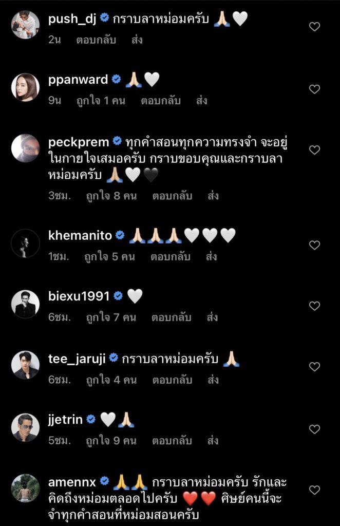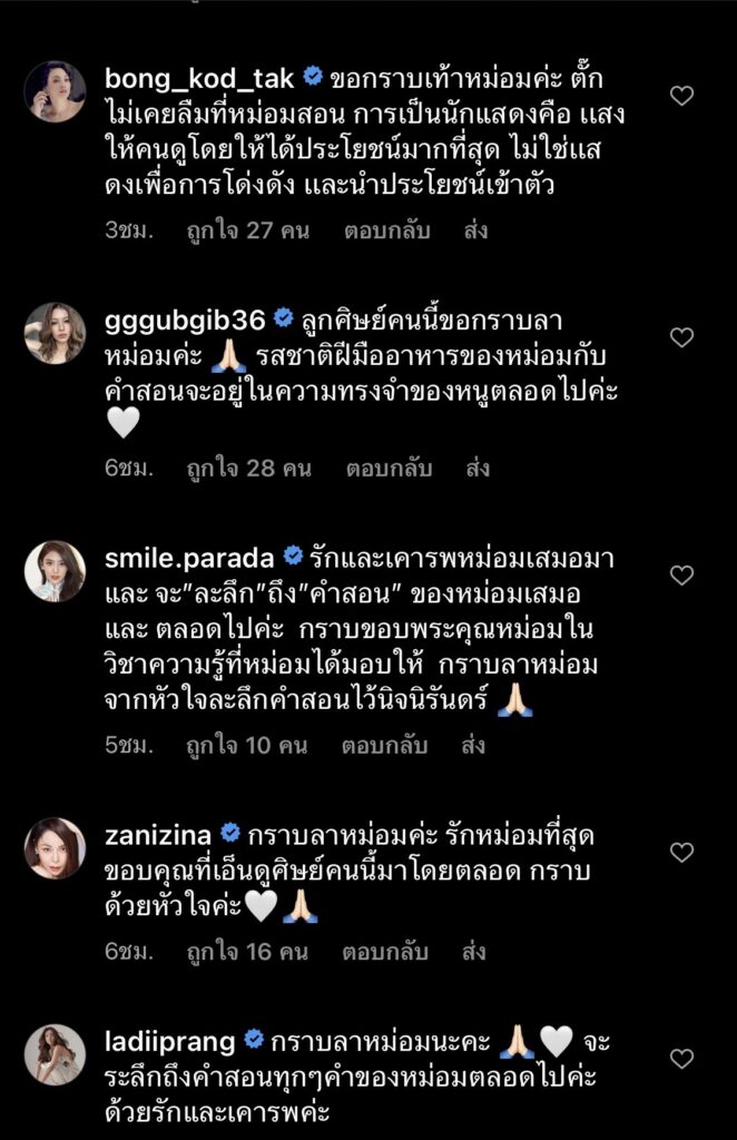 ขณะที่คนบันเทิงต่างเข้ามาคอมเมนต์น้อมรับคำสอนดังกล่าว เพื่อนำมาเตือนใจและปฏิบัติในการทำหน้าที่เป็นนักแสดง และกราบลา “หม่อมน้อย” ดวยความอาลัย