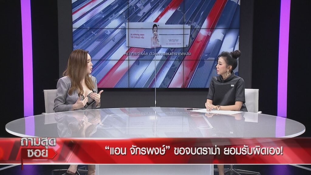 “สั้นๆ เนอะ ก็พลาด ต้องบอกว่าเราพลาด ก็กราบขออภัยคุณผู้ชมอีกครั้ง และต้นสังกัดทีวีไฟว์ ทุกคนทำหน้าที่ดีหมดแล้ว ไม่ว่าจะรายการ พิธีกร แต่เราก็เป็นที่รู้กัน เวลาเรานั่ง บางครั้งก็มีสคริปต์ บางครั้งก็ไม่มีสคริปต์ จนกลายเป็นไม่มีสคริปต์ไป เวลาถามก็ต้องเบรกให้เป็น ทำให้เป็น อันนี้ต้องฝึก และต้องรู้ด้วยจิตสำนึกว่าเราพลาด เอามาเป็นครู เป็นบทเรียน เจตนาไม่มี เพราะเราทำธุรกิจ ไม่มีเหตุผลต้องนั่งทำร้ายตัวเองหรือทำร้ายใครที่เป็นผู้หญิงด้วยกัน ไม่มีความจำเป็นตรงจุดนี้ สิ่งที่แอนควรทำบนเวที เมื่อเขาพูดชื่อเราไม่ควรคอนเฟิร์ม ขอให้หยุด อนุญาต ไม่พาดพิงถึงบุคคลที่สาม อะไรก็แล้วแต่ที่มันเกินเลย เราต้องหยุด”