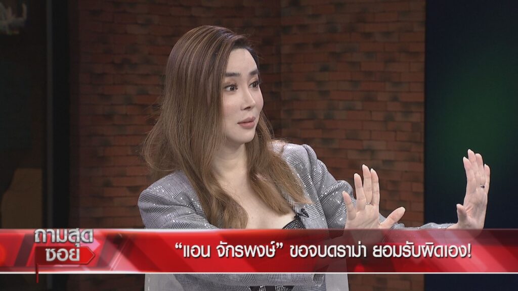 “แอนจบไปแล้ว เรื่องที่ไปรายการสดจบไปแล้ว ไม่มีอะไร ทุกคนก็ส่งคำให้กำลังใจ เราสัญญาว่าจะเฝ้ามองระวังให้ทุกอย่าง ไม่ใช่เฉพาะตัวแอนเอง แต่คอนเทนต์แอนที่ไปทุกช่อง ที่เป็นลูกค้า เราก็ต้องช่วยดูทุกอย่าง ประสบการณ์เราเพิ่มมากขึ้น มันจบแล้ว ด้วยการที่เราออกมาขอโทษกับการกระทำ ที่เราเหยียบเกียร์แรงไปหน่อย ตรงนั้นเป็นรายการสด ต้องไม่เกิดขึ้นอีก เราต้องรู้จักควบคุมสถานการณ์กับพิธีกรและโปรดิวเซอร์ได้ เราเติบโตขึ้น เราเชี่ยวชาญขึ้น”