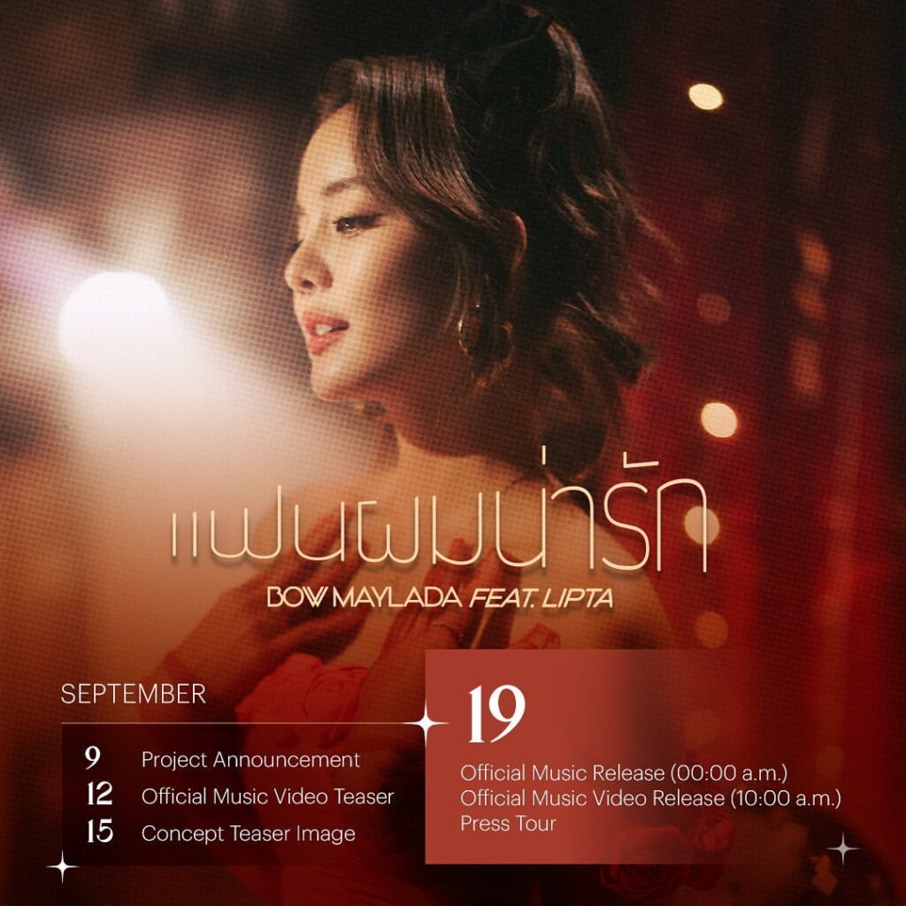 ติดตามทีเซอร์ “แฟนผมน่ารัก” วันที่ 15 กันยายน 2565 ในลุคของศิลปินเดี่ยว เท่ ๆ มีความสุขในชีวิตรัก และ เปิดตัวซิงเกิลพร้อม Music Video ตัวเต็ม ในวันที่ 19 กันยายน 2565 ผ่านช่องทาง YouTube : Ch3Thailand Music และ Application 3Plus หรือ www.ch3plus.com รวมทั้งสามารถฟังเพลงได้ทุก Streaming Platforms #เเฟนผมน่ารัก (CUTE) : Bow Maylada Feat. Lipta