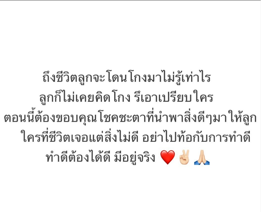 “ถึงชีวิตลูกจะโดนโกงมาไม่รู้เท่าไหร่ ลูกก็ไม่เคยคิดโกง หรือเอาเปรียบใคร ตอนนี้ต้องขอบคุณโชคชะตา ที่นำพาสิ่งดี ๆ มาให้ลูก ใครที่ชีวิตเจอแต่สิ่งไม่ดี อย่าไปท้อกับการทำดี ทำดีต้องได้ดี มีอยู่จริง”