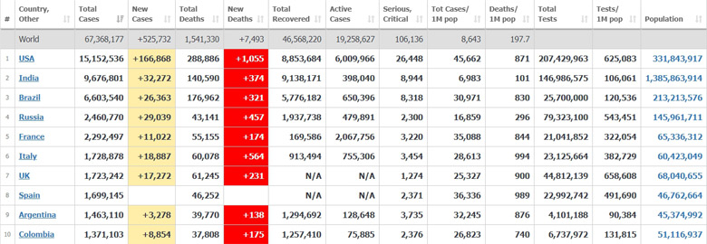 เว็บไชต์ Worldometers รายงานสถานการณ์ไวรัสโควิด-19 ประจำวันที่ 7 ธันวาคม 2563 ช่วงเวลาประมาณ 07.30 น. ตามเวลาประเทศไทย พบมีผู้ป่วยติดเชื้อทั่วโลกรวม 67,368,177 ราย เพิ่มขึ้น 525,732 ราย เสียชีวิต 1,541,330 ราย เพิ่มขึ้น 7,493 ราย รักษาหาย 46,568,220 ราย