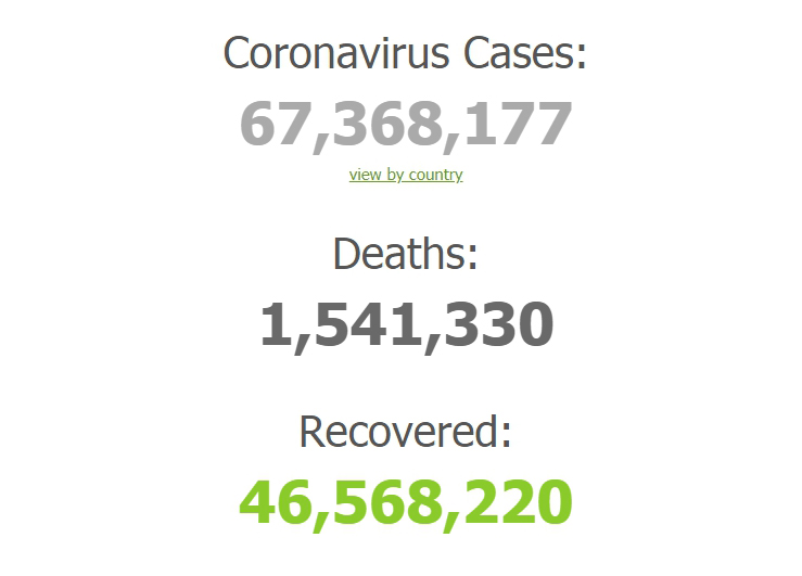 เว็บไชต์ Worldometers รายงานสถานการณ์ไวรัสโควิด-19 ประจำวันที่ 7 ธันวาคม 2563 ช่วงเวลาประมาณ 07.30 น. ตามเวลาประเทศไทย พบมีผู้ป่วยติดเชื้อทั่วโลกรวม 67,368,177 ราย เพิ่มขึ้น 525,732 ราย เสียชีวิต 1,541,330 ราย เพิ่มขึ้น 7,493 ราย รักษาหาย 46,568,220 ราย