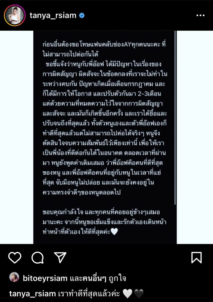 ทั้งตัวหนูเองและตัวพี่อ๊อฟเองก็ทำดีที่สุดแล้ว แต่ไม่สามารถไปต่อได้จริง ๆ หนูจึงตัดสินใจจบความสัมพันธ์ไว้เพียงเท่านี้ เพื่อให้เราเป็นพี่น้องที่ดีต่อกันได้ในอนาคต ตลอดเวลาที่ผ่านมา หนูยังพูดคำเดิมเสมอ ว่าพี่อ๊อฟคือคนที่ดีที่สุดของหนู และพี่อ๊อฟคือคนที่อยู่กับหนูในเวลาที่แย่ที่สุด จับมือหนูไม่ปล่อย และมันจะยังคงอยู่ในความทรงจำดีๆ ของหนูตลอดไป